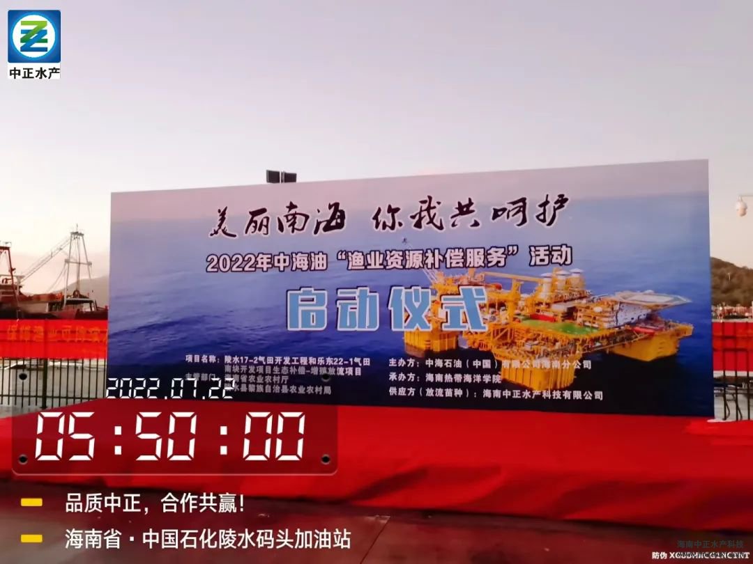 中正水产严格按照要求,在验收专家组、公证人员、 中海油代表、海南热带海洋学院代表等监督之下,投放了共计2100余万尾(粒)的青石斑鱼苗、红笛鲷苗、紫红笛鲷苗、六斑刺鲀苗、斑节对虾苗和文蛤苗。