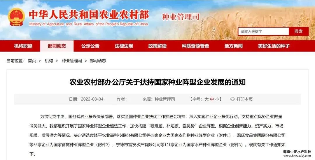 中正水产凭借企业创新能力、资产实力、市场规模、发展潜力等情况,入选“国家水产种业破难题阵型企业”。