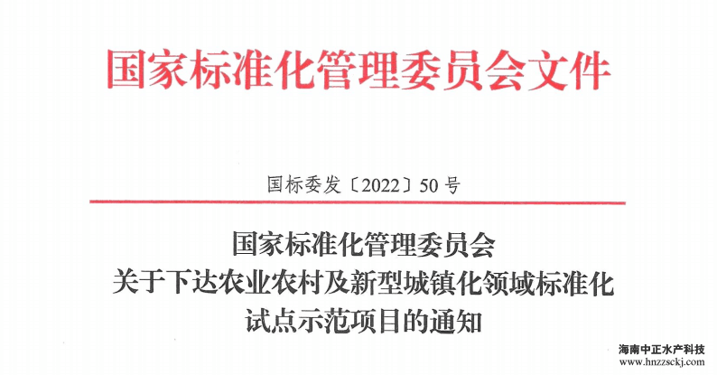 近日,国家标准化管理委员会发布关于下达农业农村及新型城镇化领域标准化试点示范项目的通知,在第十一批国家农业标准化示范区项目中,中正水产作为海南省唯一一家企业,成功入选第十一批国家农业标准化示范区项目。