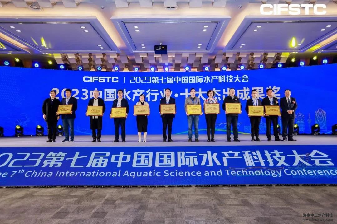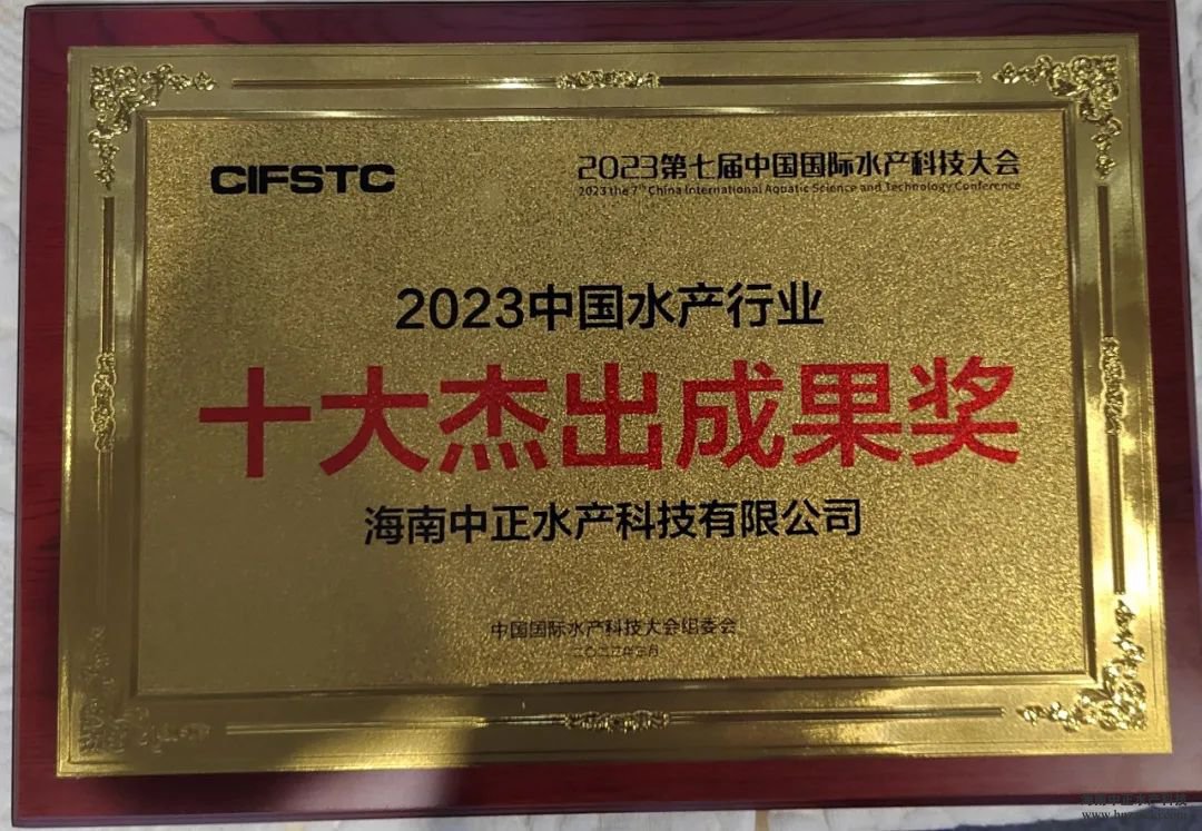 组委会根据对中正水产的综合实力、发展潜力、创新活力、成果转化率等多方面考核结果,颁予中正水产“2023中国水产行业十大杰出成果奖”。中正水产中山基地负责人罗岗代表企业上台领奖。